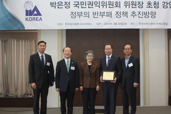 ▲지난 30일 한국프레스센터에서 열린 국제기준 내부감사 품질평가에서 권익위 박은정 위원장(사진 가운데)와 한국감사협회 권영상 회장(사진 왼쪽에서 두번째), 남동발전 김철규 감사실장(사진 오른쪽 두번째) 등이 기념촬영하고 있다. (사진=남동발전)