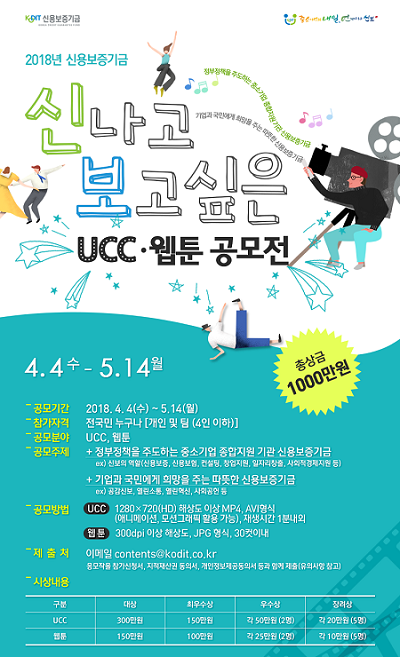 신용보증기금은 자사에 대한 국민체감도를 높이고, 국민이 공감하는 친근한 신보 이미지를 조성하기 위해 오는 5월 14일까지 '2018 신보 UCC, 웹툰 공모전'을 개최한다고 4일 밝혔다.