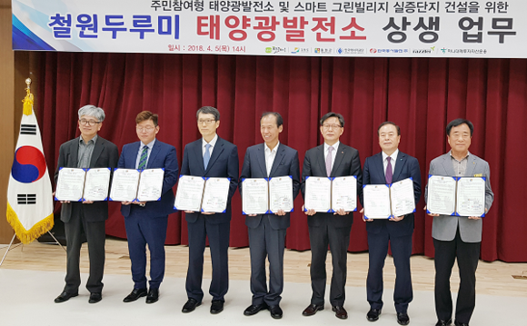 한국동서발전은 5일 강원도 철원군 갈말읍 행복자치센터에서 강원도, 철원군, 행복산촌텃골마을영농조합, 한국에너지공단, ㈜레즐러, 하나대체투자자산운용과 '철원군 주민참여형 태양광발전소 및 스마트 그린빌리지 실증단지 조성' 업무협약을 체결했다.