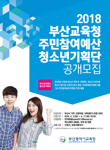 참여를 희망하는 고등학생과 대학생은 오는 17일까지 신청서, 보호자 동의서(만19세 미만)를 부산교육청 기획조정관실 예산팀에 이메일이나 팩스 등을 통해 제출하면 된다.