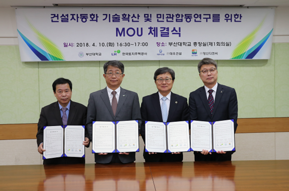 부산대학교는 국토교통 R&D 투자로 개발된 건설자동화시스템을 시범적용하고 연구성과를 공유해 건설현장으로 확대 추진하고자 10일 교내 본관 5층 제1회의실에서 LH-㈜대우건설-㈜영신디엔씨 등과 함께 '건설자동화 시범적용 공동연구' 수행을 위한 4자간 산·학·연 협약을 체결했다.