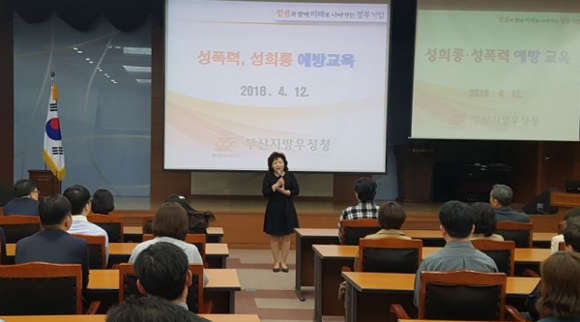 부산지방우정청은 12일 우정청 대회의실에서 청장을 포함한 전직원 및 외부 상주직원 100여명을 대상으로 성희롱·성폭력 예방 교육을 실시했다.