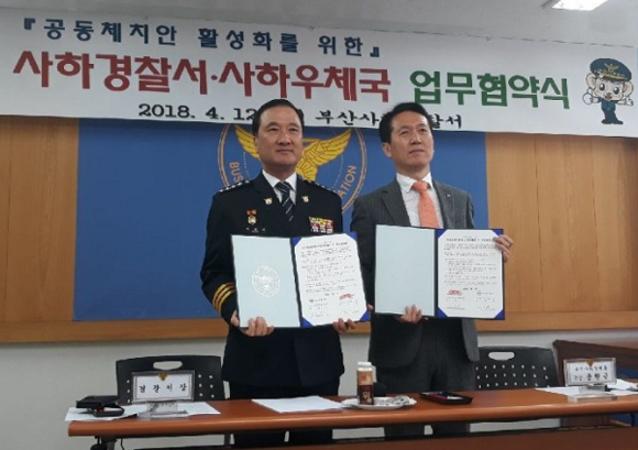 부산지방우정청 부산사하우체국은 부산사하경찰서와 최근 사하경찰서 회의실에서 국민안전을 위협하는 범죄에 대해 선제적·효과적으로 대응하고 국민이 행복한 안전사회를 실현하기 위한 업무협약을 체결했다.