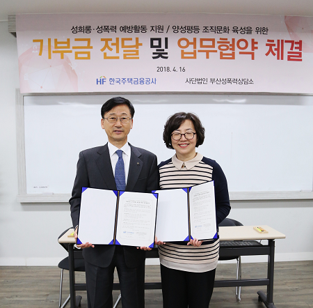▲왼쪽부터 이정환 주택금융공사 사장, 이재희 부산성폭력상담소장. (사진=주금공)