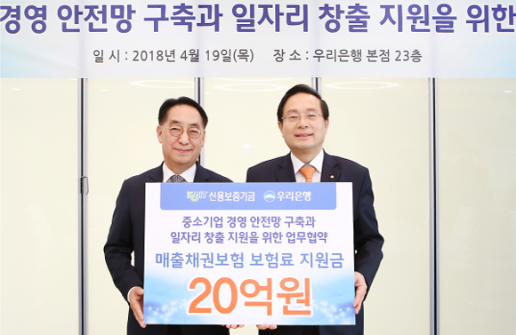 신용보증기금과 우리은행은 매출채권보험을 통한 중소기업 지원을 강화하기 위해 19일 우리은행 본점에서 '중소기업 경영안전망 구축과 일자리 창출을 위한 업무협약'을 체결했다.