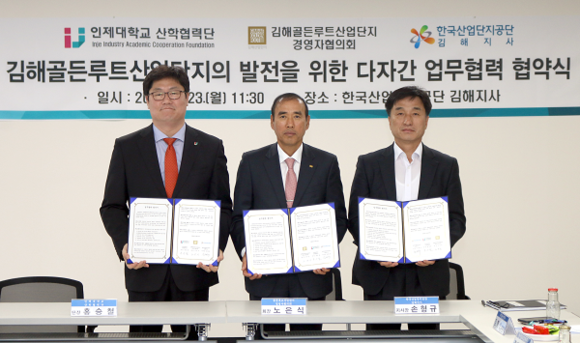 인제대학교 산학협력단은 23일 김해골든루트산업단지 경영자 협의회 및 한국산업단지공단 김해지사와 김해골든루트산업단지의 발전을 위한 다자간 업무협력 협약을 체결했다.