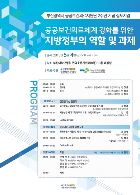 부산시공공보건의료지원단은 5월 4일 오후 2시 부산대학교병원 권역호흡기센터 13층 대강당에서 '공공보건의료체계 강화를 위한 지방정부의 역할 및 과제'라는 주제로 심포지엄을 개최한다.