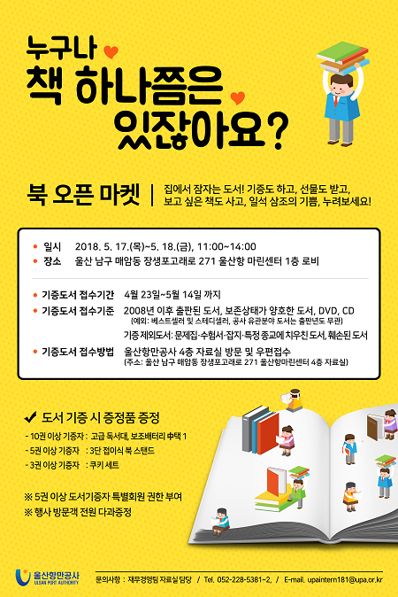 울산항만공사(UPA)가 5월 17일부터 이틀간 울산항 마린센터 1층 로비에서 '시민과 함께하는 북 오픈마켓'을 개최한다.