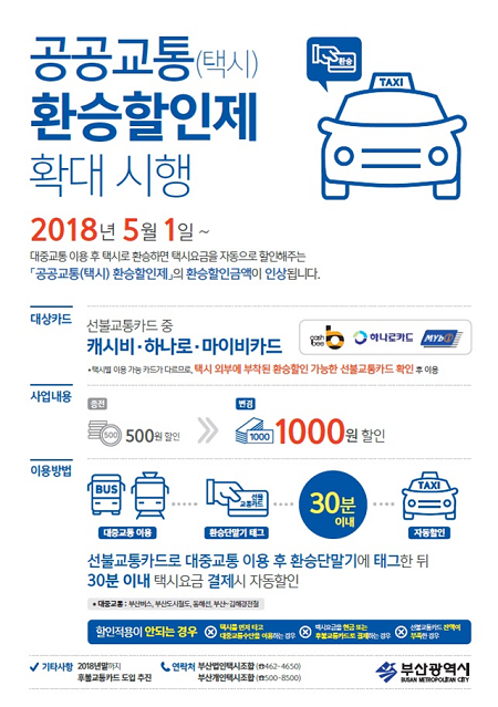 부산시는 5월 1일부터 공공교통(택시) 환승할인제 환승할인금액을 1000원으로 인상한다고 밝혔다.