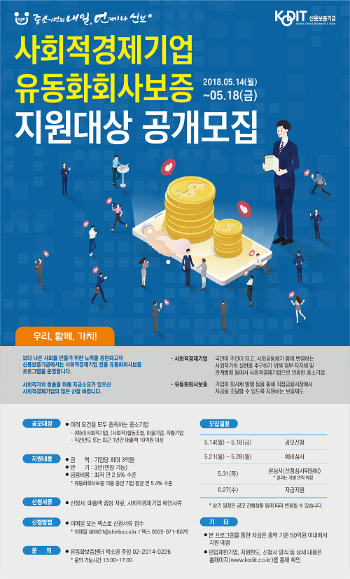 신용보증기금은 사회공동체가 함께 번영하는 사회적가치 실현을 위해 '사회적경제기업 전용 유동화보증(P-CBO) 프로그램'을 도입하고 지원대상을 모집한다고 9일 밝혔다.