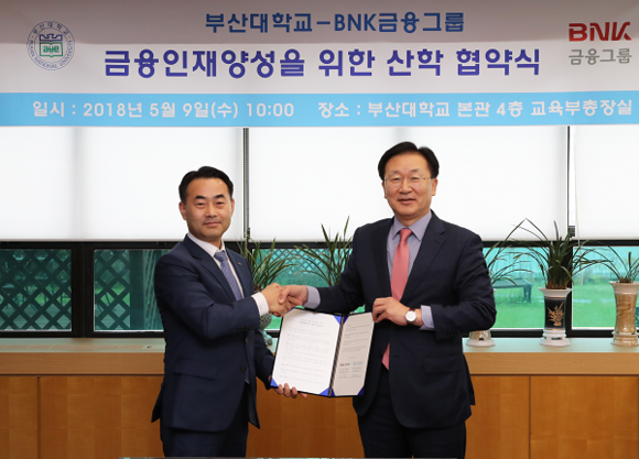 부산대학교는 BNK금융그룹과 금융인재 양성을 위한 산학협력 협약을 9일 오전 부산대 본관 4층 교육부총장실에서 체결했다.