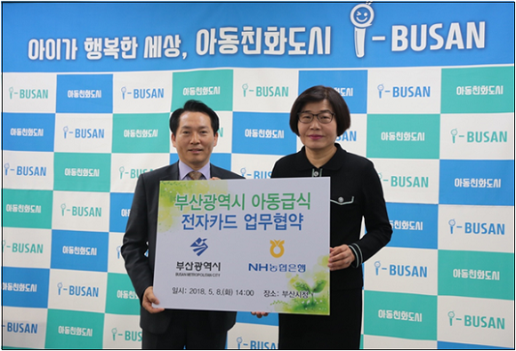 부산시와 NH농협은행은 8일 부산시청에서 백순희 여성가족국장과 정현섭 NH농협은행 부산영업본부장이 참석한 가운데 부산시 결식아동 급식지원을 위한 '아동급식전자카드' 업무협약을 체결했다.