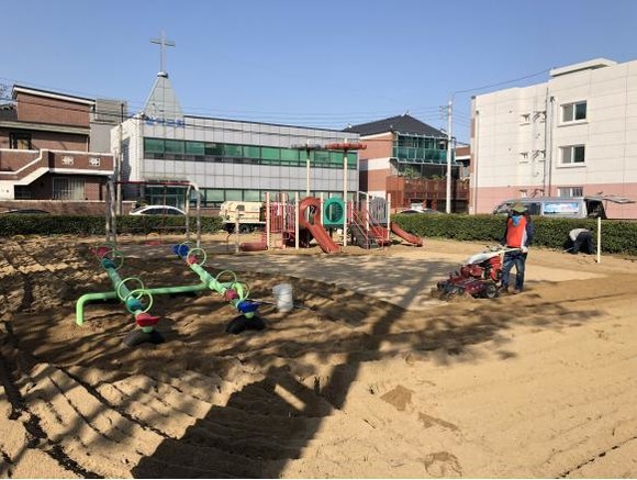 ▲목포시가 어린이공원의 놀이터에 질병을 유발할 수 있는 바이러스 등을 살균하기 위해 놀이터의 이물질을 제거한 후 관리기를 이용해 모래를 뒤집고 있다.