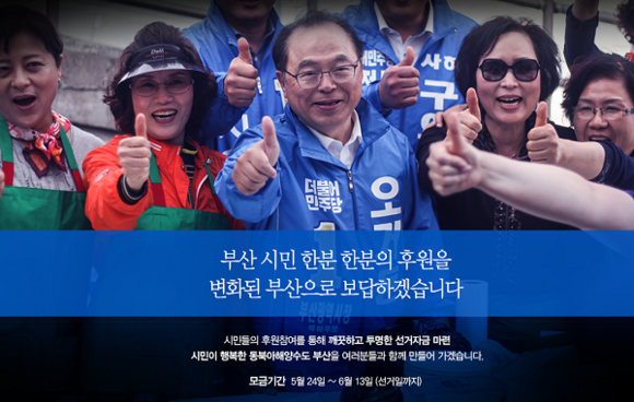 한편 오거돈 후보 후원회장은 권명보 전 국제신문 사장이 맡을 예정이다. 오거돈 후보 후원회는 “1만원 이하의 소액 후원도 소중한 참여”라며 “10만원까지는 전액 세액공제가 가능하니 많은 분들의 진심어린 참여를 부탁드린다”고 말했다.