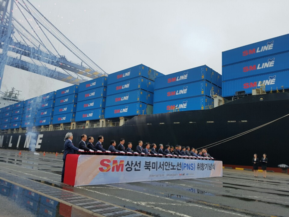 부산항만공사(BPA)는 17일 오후 부산항 신항 PNC 터미널에서 부산시, 한국선급 등 관계기관이 참여한 가운데 SM상선 북미서안노선(PNS) 취항 기념행사를 가졌다고 18일 밝혔다.