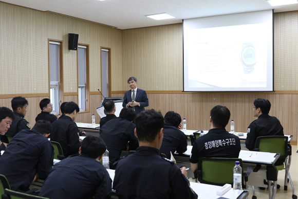 ▲고신대복음병원 김기찬 교수가 중앙해양특수구조단 대원들에게 '감압병의 이해와 치료'를 주제로 건강강좌를 진행하고 있다. (사진=고신대복음병원)