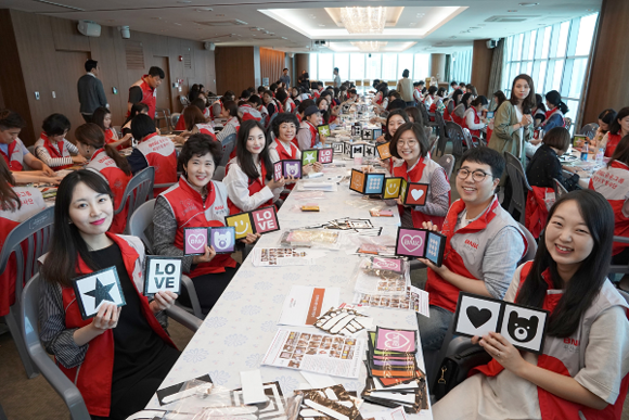 특히 이날 '해피맘박스 만들기' 봉사활동에는 신혼부부 및 출산 예정 직원들이 다수 참여해 신생아용 초점책자에 아이들을 위한 축복의 메시지를 직접 적은 손편지도 같이 담아 박스와 함께 전달했다.