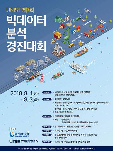 울산항만공사(UPA)는 울산과학기술원(UNIST)과 공동으로 주최하는 '제7회 빅데이터 경진대회'에 참가할 대학생을 모집한다고 26일 밝혔다.