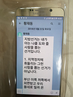 ▲황재관 부산 북구청장 후보의 동생인 황재동씨가 보낸 문자 메시지 일부. (사진=정명희 캠프)