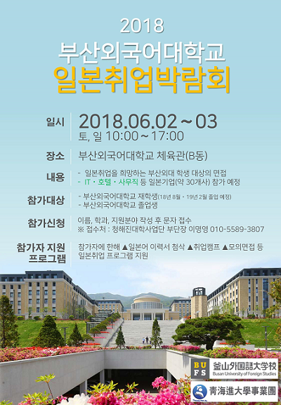 부산외국어대학교는 오는 6월 2, 3일 양일간 교내 체육관에서 '2018년 일본취업박람회'를 개최한다고 31일 밝혔다.