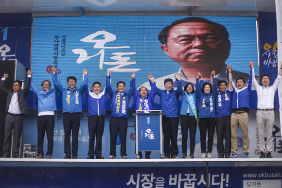 ▲민주당 오거돈 부산시장 후보가 31일 남구 일대에서 박재범 남구청장 후보과 공동 유세를 하고 있다.