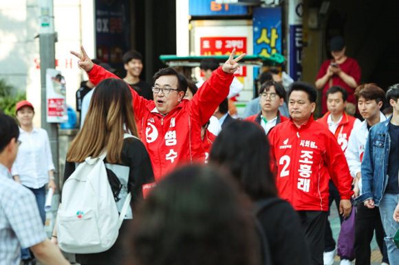 ▲한국당 서병수 부산시장 후보가 31일 사상구 일대 거리유세에서 시민들에게 지지를 호소하고 있다. (사진=서병수 캠프)