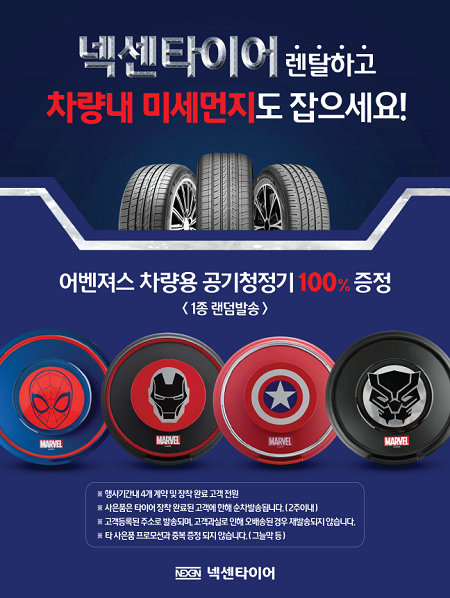 이번 이벤트는 오는 30일까지 진행되며, 넥센타이어 4개를 렌탈서비스로 이용하는 신규 고객 전원에게 마블 공기청정기(차량/실내 겸용)를 증정한다.