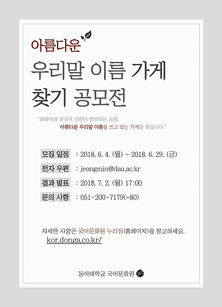 동아대학교 국어문화원이 '아름다운 우리말 이름 가게 찾기 공모전'을 오는 29일까지 갖는다.