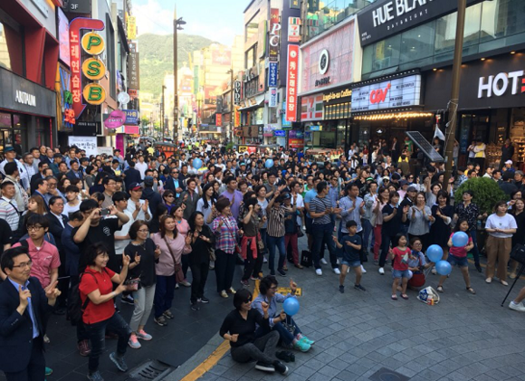 ▲지난 9일 부산 서면 쥬디스태화 앞에서 열린 김석준 부산교육감 후보 유세에 시민들이 운집한 모습. (사진=김석준 캠프)