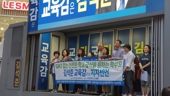 ▲GMO없는 안전한 학교 급식을 원하는 학부모 단체가 김석준 부산교육감 후보 지지선언을 하고 있다.