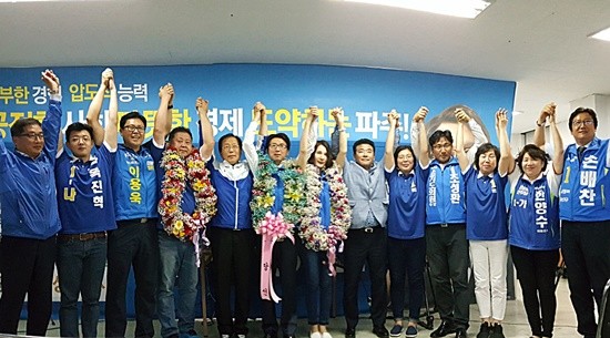 당선이 확실시 되자 13일 밤 늦은 시간까지 박정 국회의원, 윤후덕 국회의원, 시도의원 당선자 등과 지지자들이 발디딜틈 없이 모여 꽃다발을 목에 건 최종환 당선인 부부를 축하했다.