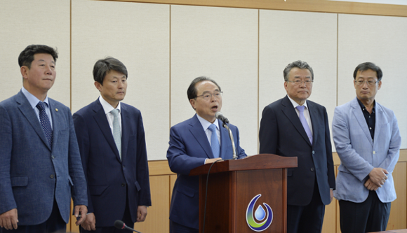 ▲오거돈 부산시장 당선인이 18일 부산시 상수도사업본부에 마련된 인수위원회 사무실에서 신임 유재수 경제부시장 내정자(왼쪽 2번째)와 박상준 정무특보 내정자(오른쪽 2번째)를 소개하고 있다. (사진=최원석 기자)