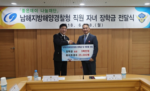 남해지방해양경찰청은 18일 주류 제조업체인 무학의 '좋은데이 나눔재단'으로부터 해양경찰 자녀 장학금 500만원과 위문품을 기증받았다고 밝혔다.