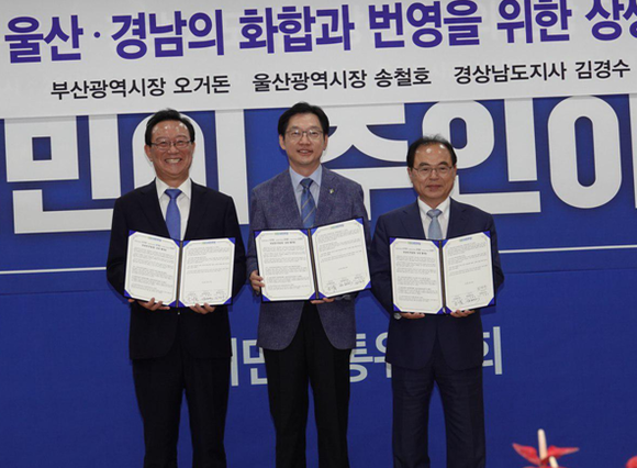 세 당선인은 “지역 간 갈등과 균열을 뛰어넘어 균형발전과 자치분권이라는 공동의 가치를 실현하기 위한 또 하나의 도전을 시작한다”며 6개 항으로 이뤄진 '동남권(부울경) 상생 협약문'에 서명했다.