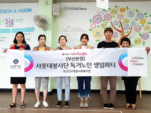 롯데백화점 부산본점 샤롯데 봉사단은 26일 부산진구종합사회복지관과 연계해 부산진구 소재 홀몸어르신을 초청해 생일 잔치 및 생필품 기증 봉사 활동을 시행했다. 부산본점 샤롯데 봉사단은 매월 홀몸어르신 돌봄 및 생필품 기증 봉사 활동을 정기적으로 시행하고 있다. (사진=롯데백화점)