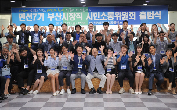 ▲지난 22일 민선7기 부산시장직 시민소통위원회 출범식에서 오거돈 부산시장 당선인(앞줄 가운데)을 비롯한 시민소통위 관계자들이 기념촬영을 하고 있다. (사진=부산시장직 시민소통위)