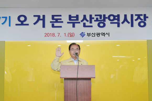 ▲오거돈 부산시장이 1일 오전 부산시청에서 열린 약식 취임식에서 취임선서를 하고 있다.