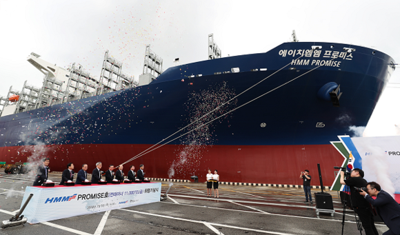 5일 오후 부산항 신항 4부두(HPNT)에 현대상선의 1만 1000TEU급 컨테이너선 'HMM Promise 호'가 입항해 관계자 100여명이 참석한 가운데 취항식이 열렸다. 이 선박은 작년 8월 한진중공업으로부터 인수한 1만 1000TEU급 컨테이너선 2척 중 첫 번째 선박으로 현재 전세계 운항중인 메가 컨테이너선 중 유일하게 황산화물 정화장치인 '스크러버'를 장착했다. (사진=부산항만공사)