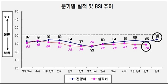 경기전망지수(BSI)는 100을 기준으로 그 이상이면 경기 회복을, 그 미만이면 경기 악화를 의미한다.