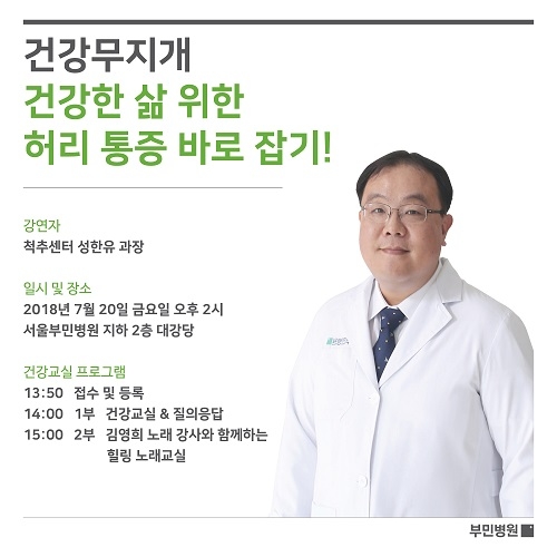 7월은 '건강한 삶 위한 허리 통증 바로 잡기'라는 주제로, 디스크, 척추관협착증, 골다공증 등 각 질환별 요통의 원인과 올바른 치료법에 대한 강의가 이뤄질 예정이다. 건강교실의 강사로는 서울부민병원 척추센터 성한유 과장이 진행한다. 2부에는 김영희 노래 강사와 함께하는 힐링 노래교실도 진행하며 병환으로 지친 환자들에게 즐거움을 선사할 예정이다.