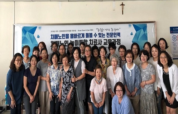 부산가톨릭대 사회서비스센터 산하 Busan Share&Care(치매관리 케어비즈니스형 사회서비스 일자리 창출)사업단이 지난 26일 개강한 '치매노인 놀이통합 치료사 교육과정 5기 과정'에 58명이 지원, 2.3대 1의 경쟁률을 기록하는 등 끊임없는 관심을 받고 있다.