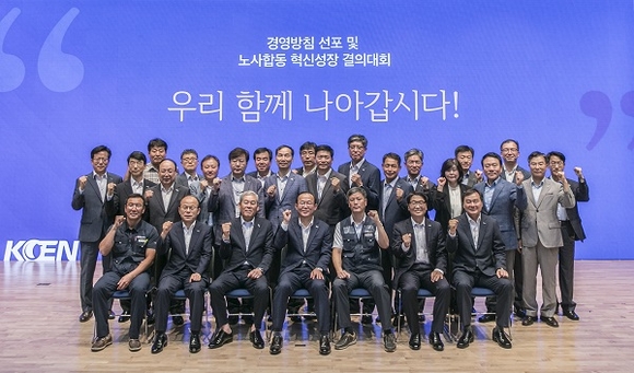 ▲30일 남동발전 진주 본사에서 열린 혁신성장결의대회에서 노사 관계자들이 기념촬영을 하고 있다. (사진=남동발전)