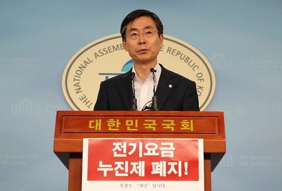 ▲조경태 국회의원이 1일 국회 정론관에서 기자회견을 열고 전기요금 누진제 폐지내용을 담은 법안을 발표하고 있다. (사진=연합뉴스)