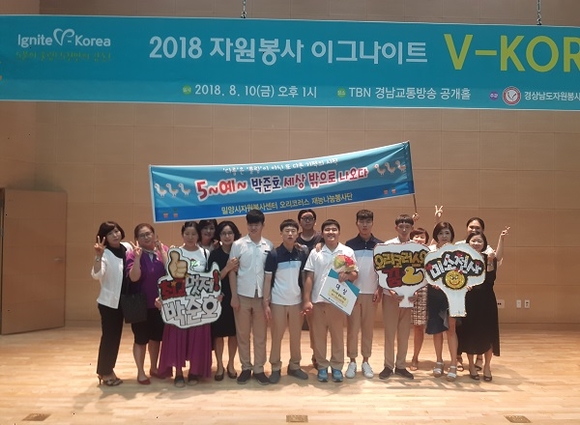 경남 밀양시는 행정안전부와 한국중앙자원봉사센터가 후원하는 '2018 자원봉사 이그나이트 브이코리아(V-KOREA) 경남대회'에서 시 장애인 재능봉사팀 '오리코러스'의 단원 박준호 학생(밀성고 1)이 대상을 수상했다고 13일 밝혔다.