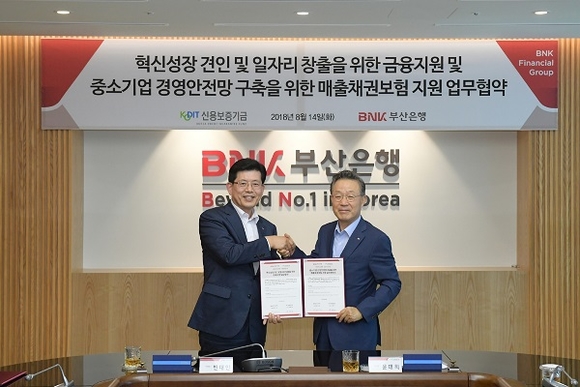 BNK부산은행은 14일 부산 본점에서 신용보증기금과 '혁신성장 견인 및 일자리창출을 위한 금융지원 업무협약'을 맺고 특별출연금 15억원, 보증료지원금 1억원을 신용보증기금에 출연해 총 480억원의 협약보증대출을 지원하기로 했다.