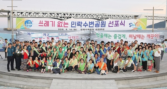 부산 수영구는 14일 자연보호 협의회 등 지역 봉사단체 100여명이 참여한 가운데 매년 지속적으로 야기되는 수변공원 쓰레기 문제 해결을 위해 '쓰레기 없는 민락수변공원' 선포식 및 캠페인 행사를 가졌다. (사진=수영구)