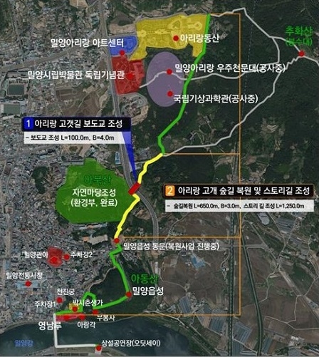 '밀양 아리랑의 옛 이야기, 아리랑 고갯길 조성사업'은 내일동 일원에 내년부터 `21년까지 3년간 34억 4300만 원의 사업비를 투입해 기 조성된 아리랑길 코스 중 `00년대 초 도시계획도로 개설(밀양성당 앞)로 보행동선이 일부 단절된 구간에 보도교 설치(L=100m, B=4.0m) 및 숲길을 복원(L=650m)해 우리나라 3대 누각 중 하나인 영남루에서 아북산 자연마당, 국립기상과학관을 거쳐 밀양대공원, 추화산성까지 연결하는 도심 속 역사·문화·관광벨트를 구축하는 사업이다.