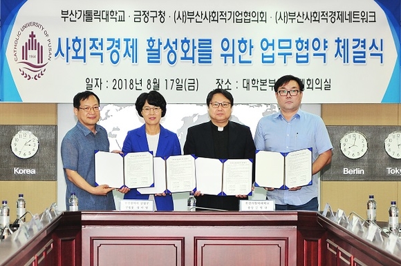 부산 금정구는 17일 부산가톨릭대학교, (사)부산사회적기업협의회, (사)부산사회적경제네트워크와 '사회적경제 활성화를 위한 업무협약'을 체결했다.