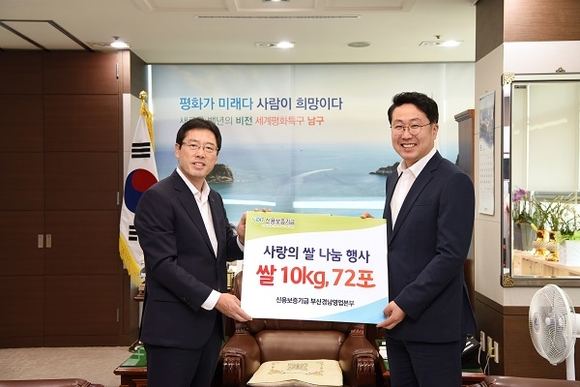 신용보증기금 부산경남영업본부는 지난 17일 부산 남구청에 저소득층 주민을 위한 쌀 10kg 72포(200만원 상당)를 기탁했다.