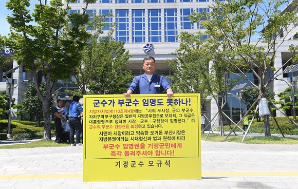 오규석 기장군수가 부군수 임명권 반환을 촉구하는 무기한 1인 시위를 업무공백을 최소화고자 매주 화요일 점심시간을 이용해 부산시청 시민광장 앞에서 이어나가고 있다.
